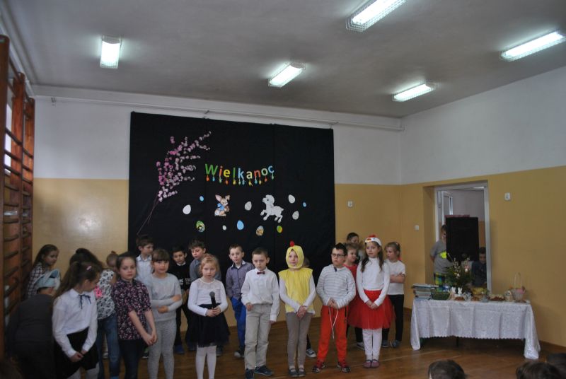28 marca 2018r. w naszej szkole odbyła się uroczyste spotkanie związane ze zbliżającymi się świętami wielkanocnymi. Program przygotowali uczniowie klas I-III wraz ze swoimi wychowawczyniami. Klasa I pokazała nam scenkę ,,Bajka o wielkim jaju”. Zobaczyliśmy jak ważne są jajka niezależnie od wielkości. W okresie świątecznym kury muszą znieść dużo jajek. Są one potrzebne na pisanki, malowanki, rysowanki, oklejanki. Udało się też jajko olbrzym, które nie chciało być żadną z tych postaci. Dopiero, gdy dzieci wytłumaczyły mu jak ważna jest rola jajek na Wielkanoc, zgodziło się być pisanką.