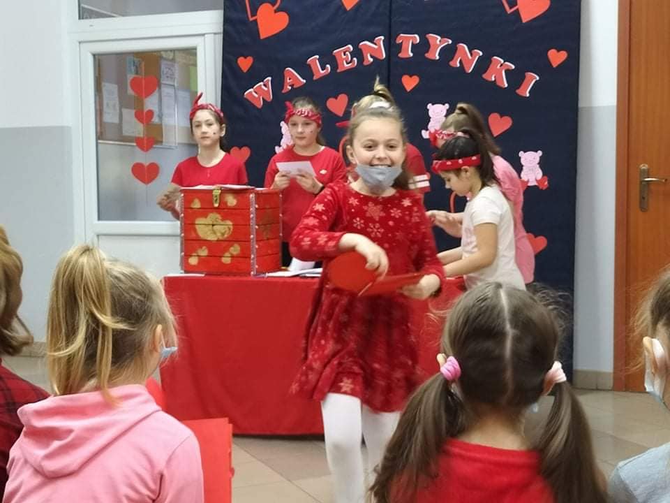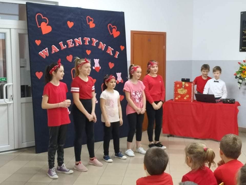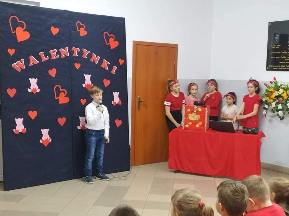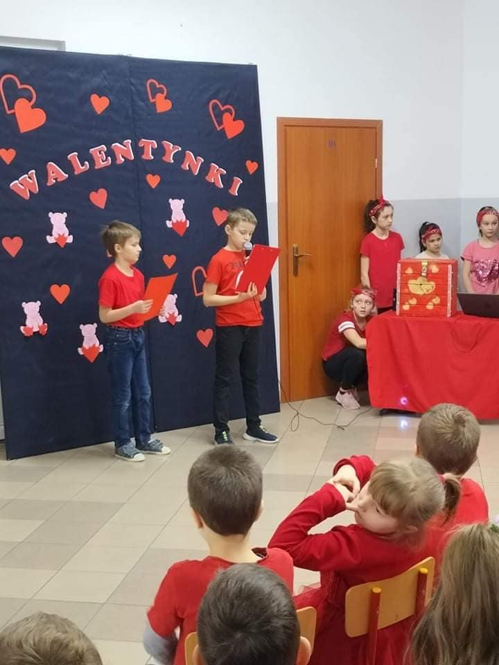 Jakub z Sebastianem zapoznali zgromadzoną publiczność z sylwetką świętego Walentego- patrona zakochanych, pszczelarzy i chorych na padaczkę oraz przedstawili kilka ciekawostek o poczcie walentynkowej. Wiktor natomiast zaśpiewał piosenkę pt.”Deszcz”.