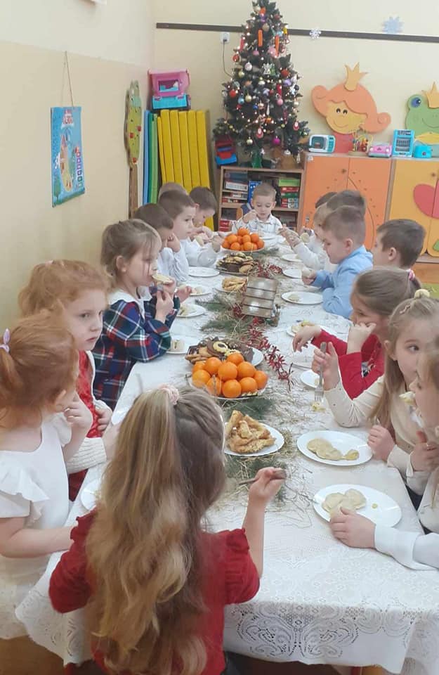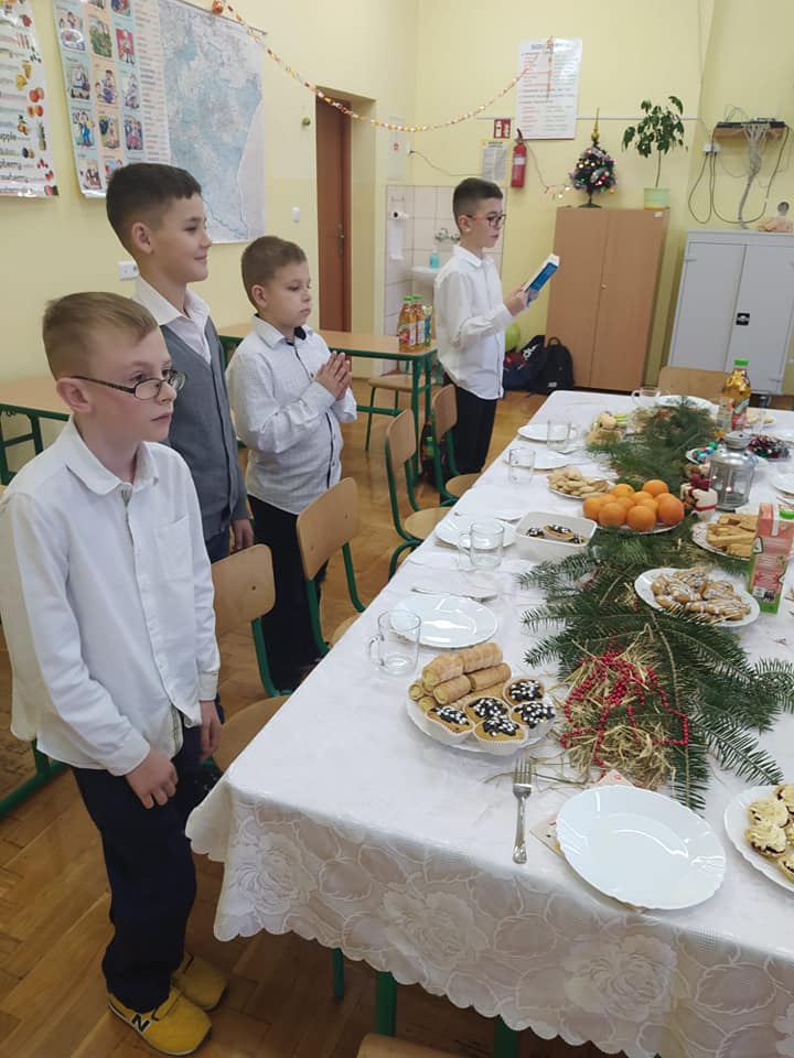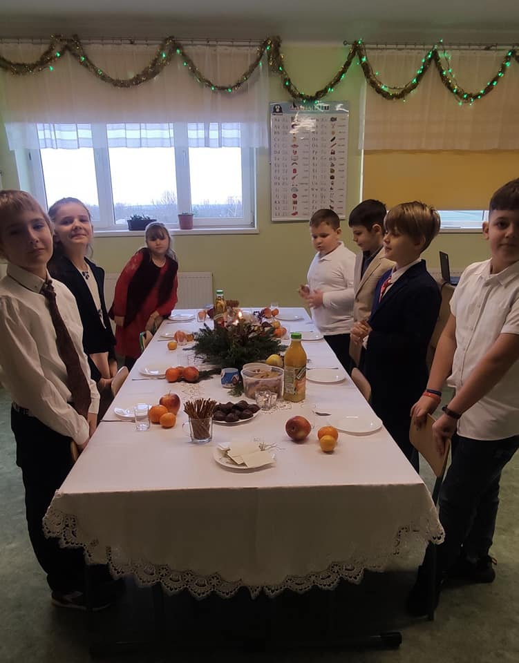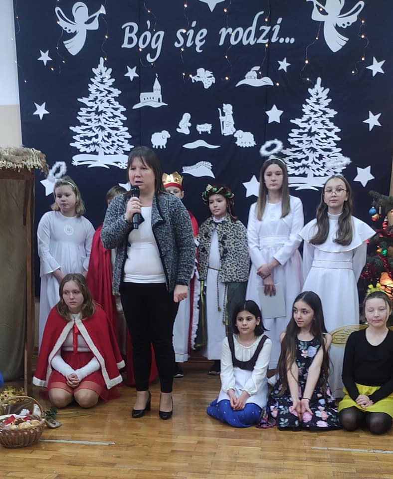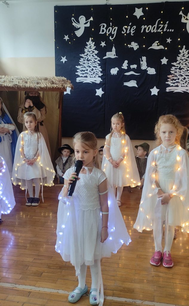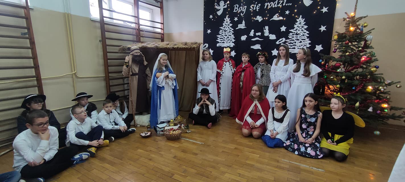 Słowa tej pięknej kolędy były mottem programu artystycznego , który odbył się 20.12.2023 r. z okazji zbliżających się Świąt Bożego Narodzenia. Najpierw na scenie zaprezentowały się dzieci z oddziałów przedszkolnych: zerówki oraz Krainy Uśmiechu. W ich wykonaniu zgromadzona publiczność obejrzała pełne ekspresji układy taneczne. Następnie uczniowie z klas starszych zaprosili do obejrzenia tradycyjnych Jasełek. Do szopki, w której odpoczynek znaleźli Maryja z Józefem, z darami dla narodzonego Jezusa przybyli pasterze, królowie, uczniowie i postaci z bajek. A nad bezpieczeństwem Świętej Rodziny czuwali Aniołowie. Po zakończeniu części artystycznej, przedstawiciele Samorządu Uczniowskiego złożyli świąteczne życzenia nauczycielom, pracownikom szkoły oraz koleżankom i kolegom. Następnie głos zabrała pani dyrektor Bożena Szczepankiewicz, która podziękowała młodym artystom za piękny występ i przekazała wzruszające życzenia całej społeczności szkolnej. W świątecznej atmosferze przedszkolaki i uczniowie udali się do swoich klas, gdzie wraz z wychowawcami zasiedli do wigilijnego stołu. Pięknie udekorowane stoły,a na nich biały opłatek,śpiew kolęd, zapach wigilijnych potraw i radość z serca płynąca, sprawiły, że był to niezwykły dzień .