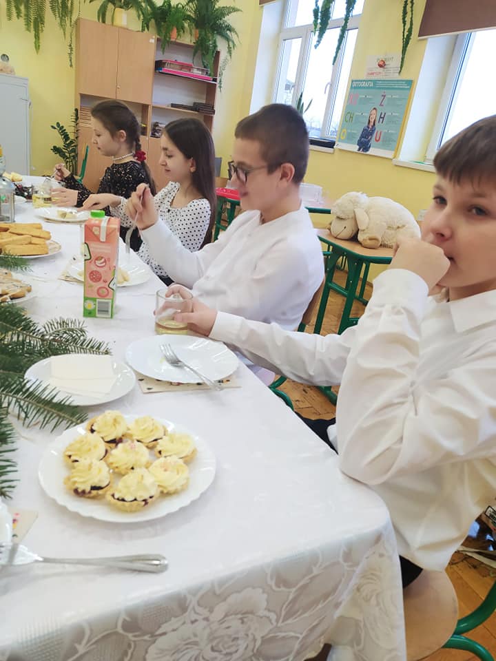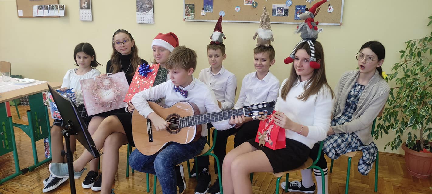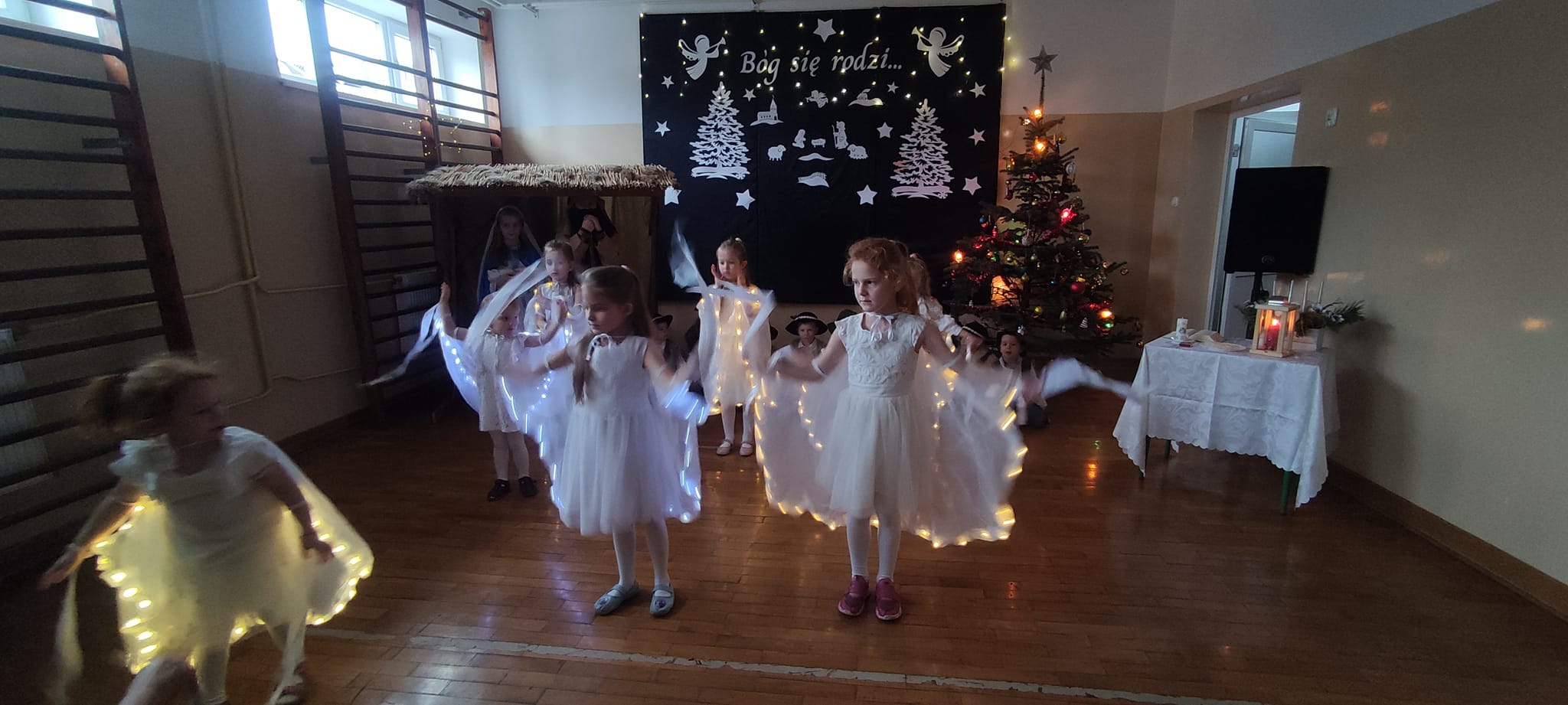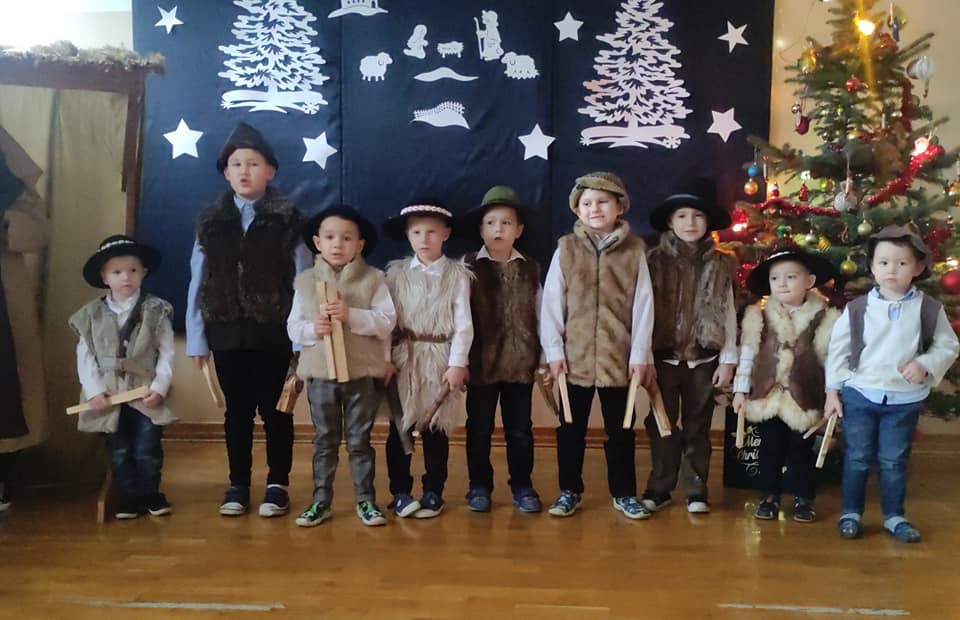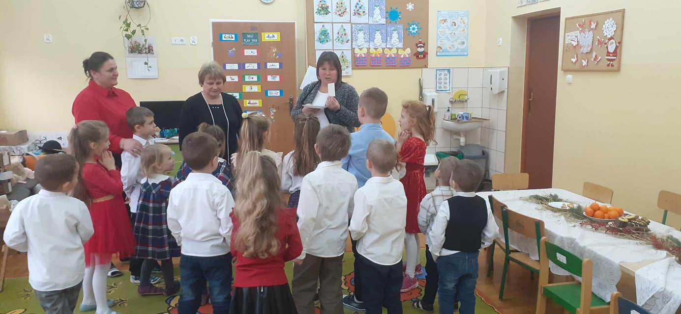 Słowa tej pięknej kolędy były mottem programu artystycznego , który odbył się 20.12.2023 r. z okazji zbliżających się Świąt Bożego Narodzenia. Najpierw na scenie zaprezentowały się dzieci z oddziałów przedszkolnych: zerówki oraz Krainy Uśmiechu. W ich wykonaniu zgromadzona publiczność obejrzała pełne ekspresji układy taneczne. Następnie uczniowie z klas starszych zaprosili do obejrzenia tradycyjnych Jasełek. Do szopki, w której odpoczynek znaleźli Maryja z Józefem, z darami dla narodzonego Jezusa przybyli pasterze, królowie, uczniowie i postaci z bajek. A nad bezpieczeństwem Świętej Rodziny czuwali Aniołowie. Po zakończeniu części artystycznej, przedstawiciele Samorządu Uczniowskiego złożyli świąteczne życzenia nauczycielom, pracownikom szkoły oraz koleżankom i kolegom. Następnie głos zabrała pani dyrektor Bożena Szczepankiewicz, która podziękowała młodym artystom za piękny występ i przekazała wzruszające życzenia całej społeczności szkolnej. W świątecznej atmosferze przedszkolaki i uczniowie udali się do swoich klas, gdzie wraz z wychowawcami zasiedli do wigilijnego stołu. Pięknie udekorowane stoły,a na nich biały opłatek,śpiew kolęd, zapach wigilijnych potraw i radość z serca płynąca, sprawiły, że był to niezwykły dzień .